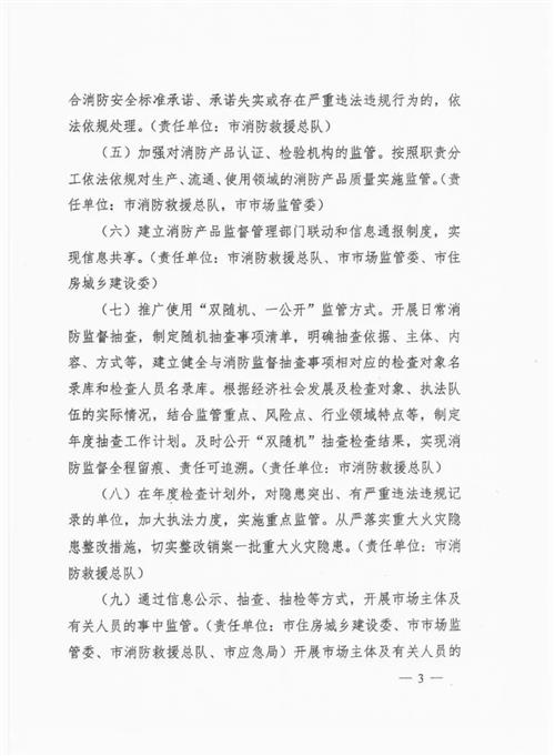 三是建立健全督促保障机制。《若干措施》要求各区政府要将消防执法改革精神纳入教育培训内容,进一步细化工作措施,确保工作有序推进。市应急局要与消防部门建立健全督促指导、推动落实、责任追究工作机制,各部门工作任务落实情况将纳入各级工作考核。