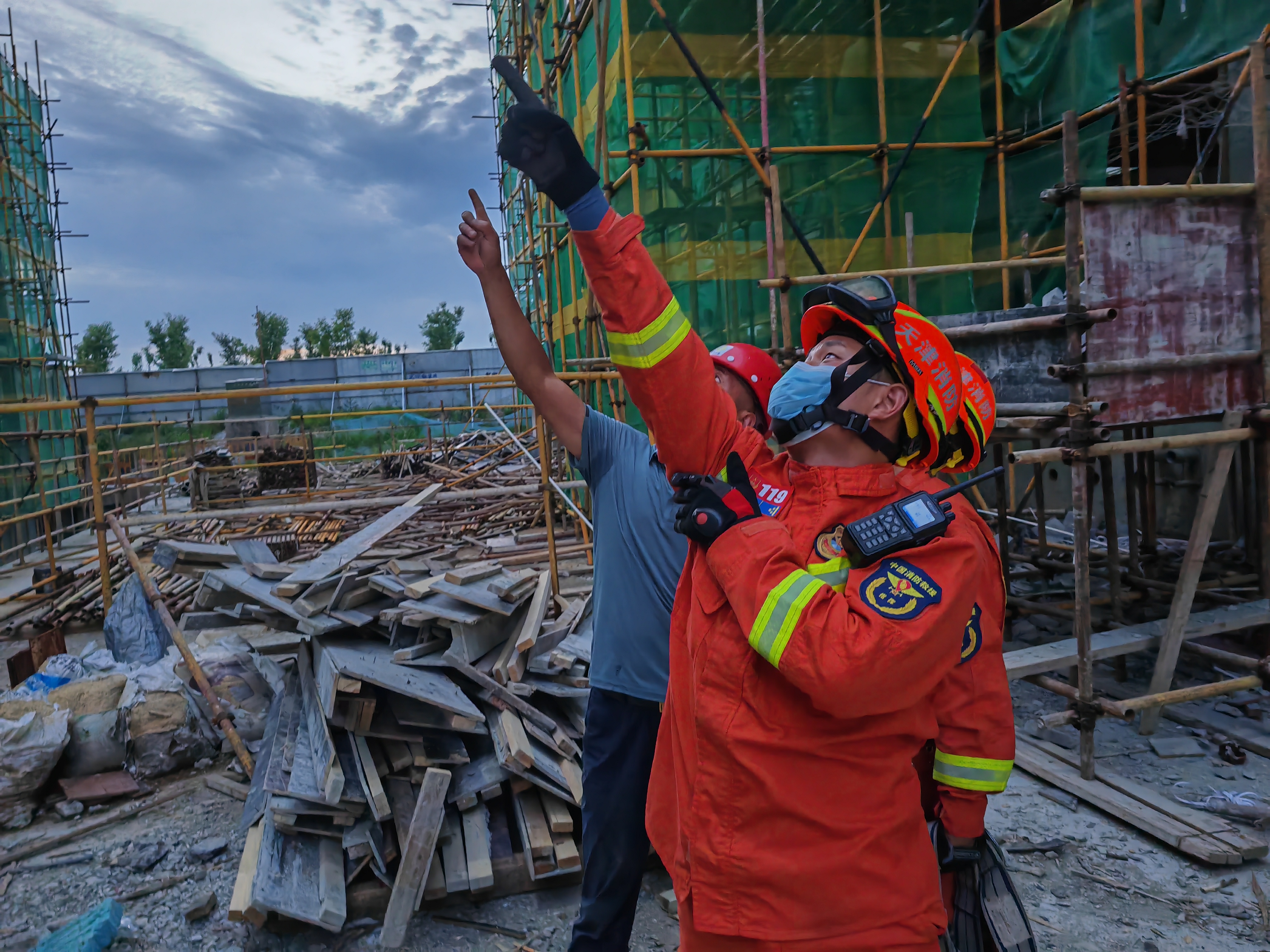因事发地为建设工程施工现场,场地情况十分复杂,杂物纵横,大型举高车辆无法靠近,现场指挥部迅速决策,在制定好救援方案、设置好安全员的前提下,立即组织突击队,实施救援。