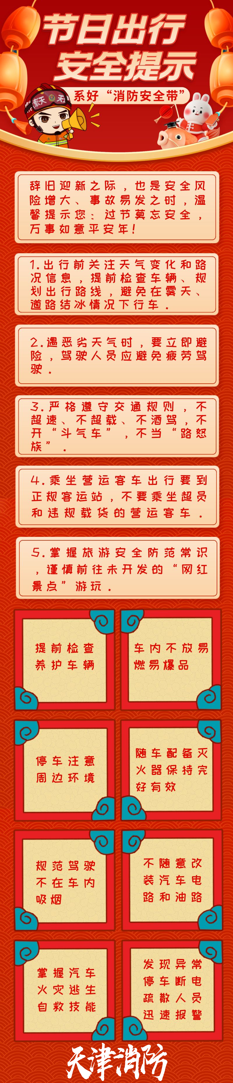 天津滨海消防提醒您:春节期间,外出游玩,注意行车安全。