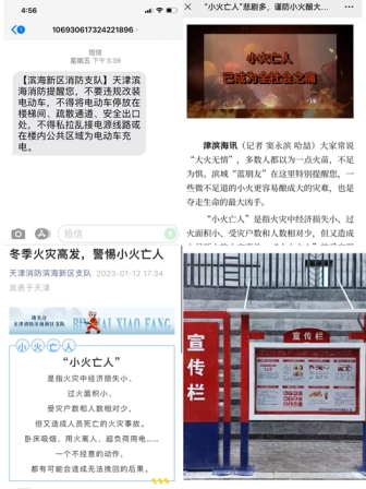 活动结合消防宣传“五进”工作,宣传人员发动志愿者、民警等人员重点深入商市场、企事业单位、“九小场所”、居民小区等地,开展消防安全检查和“手把手”宣传服务,普及火灾报警、自救逃生知识技能,并先后张贴消防宣传提示海报1万余份,为市民输送平安的理念;通过“两微两号”平台向25万余名粉丝每天发布消防安全提示,有效拓展了消防安全宣传的覆盖面和传播力度;依托“津滨海”APP、户外电子大屏、楼宇电视、公交车车载电视及“村村通”等载体,播发预防“小火亡人”火灾事故主题消防安全公益广告、音频,强势掀起消防宣传攻势。通过手机短信平台,向目标人员发送消防提示短信9000余条。