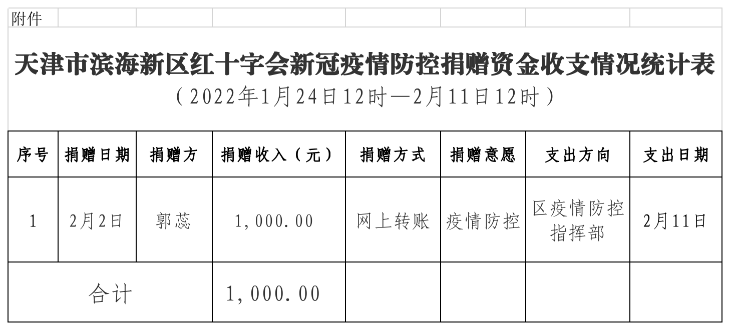 自2022年1月24日12时—2月11日12时,天津市滨海新区红十字会接收新冠疫情防控捐赠资金1000元,已按捐赠意愿全部划转至区疫情防控指挥部。