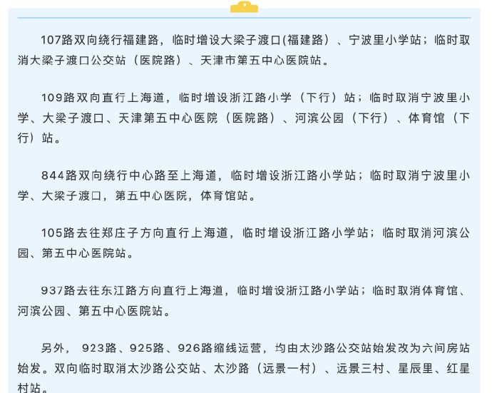从滨海新区公交集团了解到,受施工影响,道路交通导行有调整,滨海多条公交线路有调整,请市民注意站点变化。