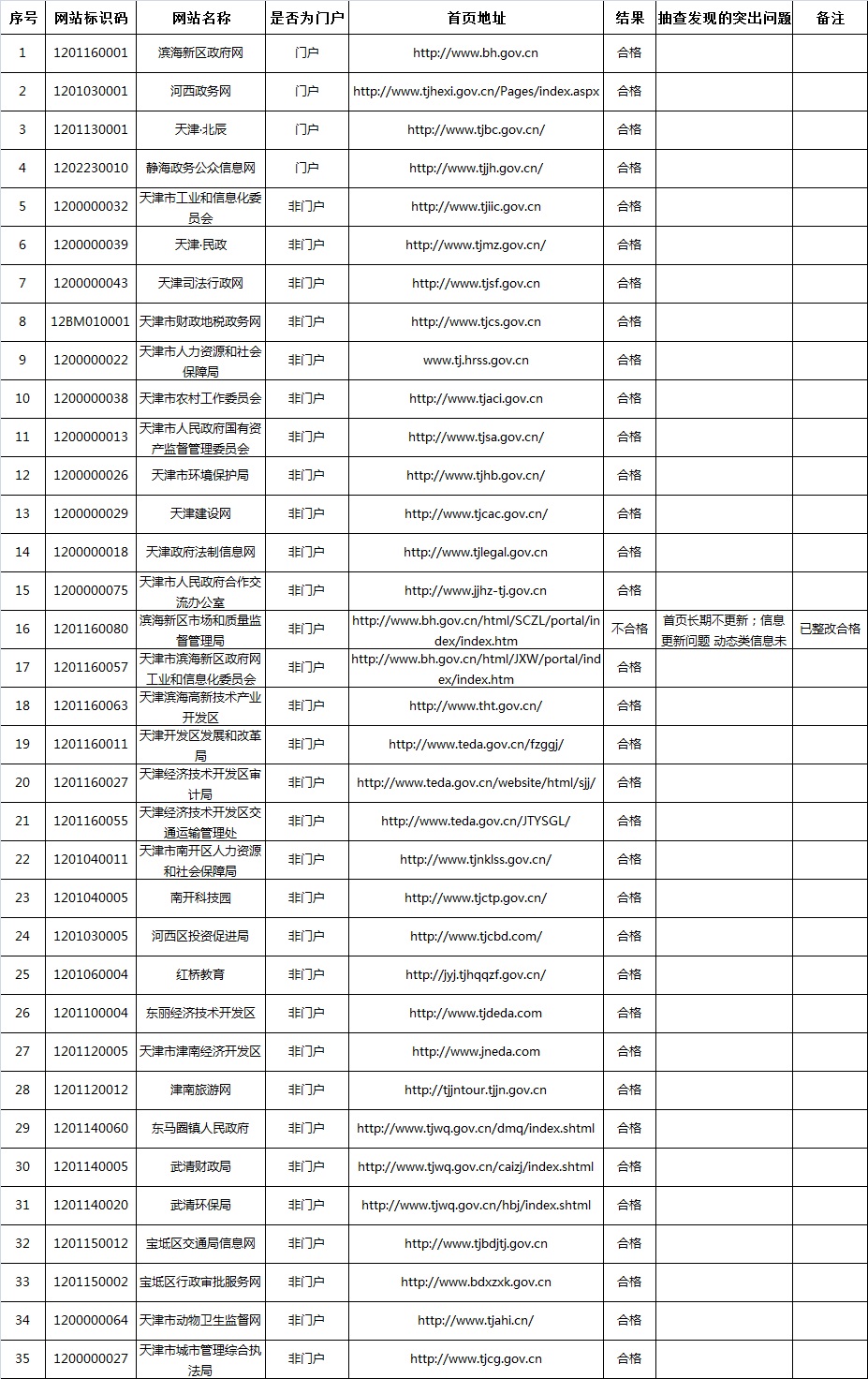 根据国务院办公厅工作安排,2017年二季度,天津市共抽查政府网站35个,抽查比例13.2%,抽查合格率为97.1%。存在的问题主要是网站首页栏目更新不足,基本信息类栏目更新不及时,个别网站首页可用性差等。对不合格网站,天津市政府办公厅立即督办整改,要求其限时完成整改任务。目前,不合格网站已整改合格并在线达标运行。现将抽查情况公布如下: