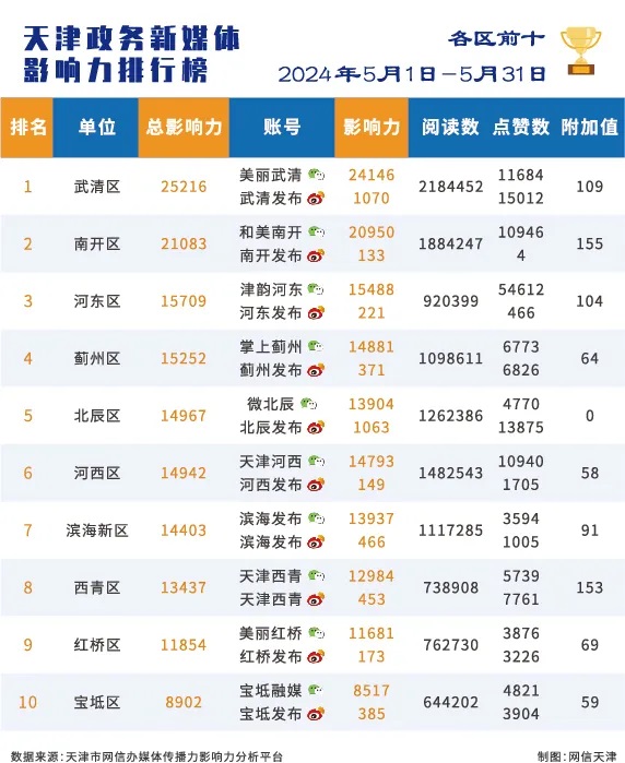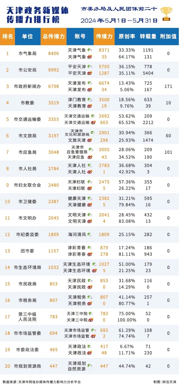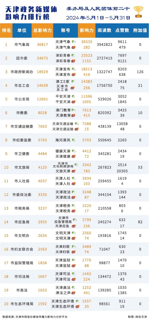 | 2024年5月份天津政务新媒体传播影响力排行榜 |