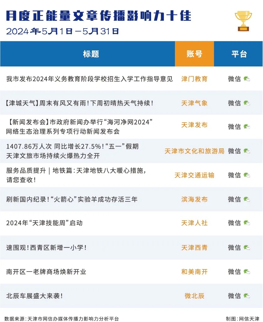 5月份,各级政务新媒体紧密围绕京津冀协同发展、“五一”国际劳动节、五四青年节、天开高教科创园向“新”而行等热点,加强议题设置、创新叙事方式,推出一批网络正能量精品和深度报道,全面展示天津培育发展新质生产力的显著成效,为全面建设社会主义现代化大都市营造浓厚网络舆论氛围。