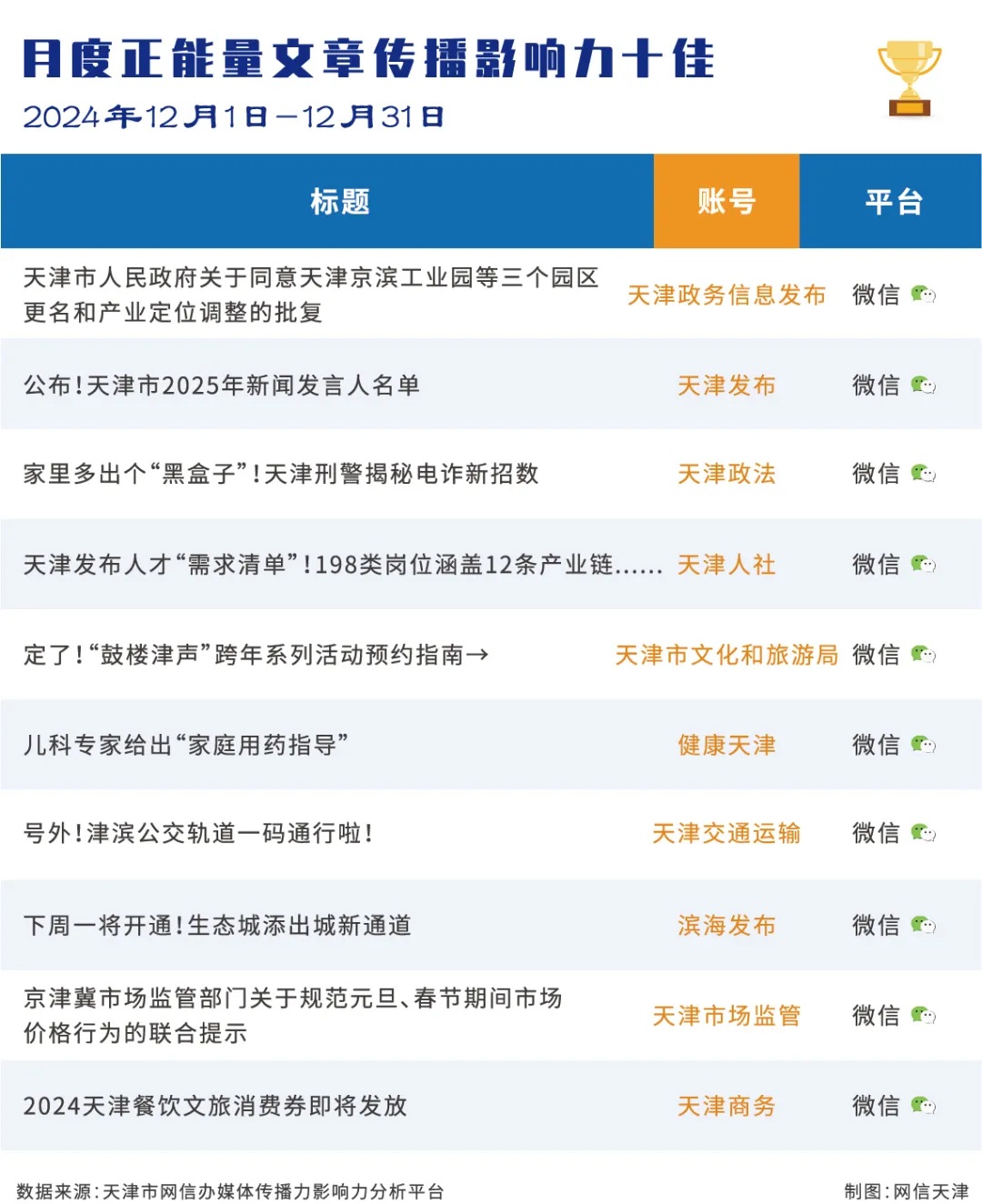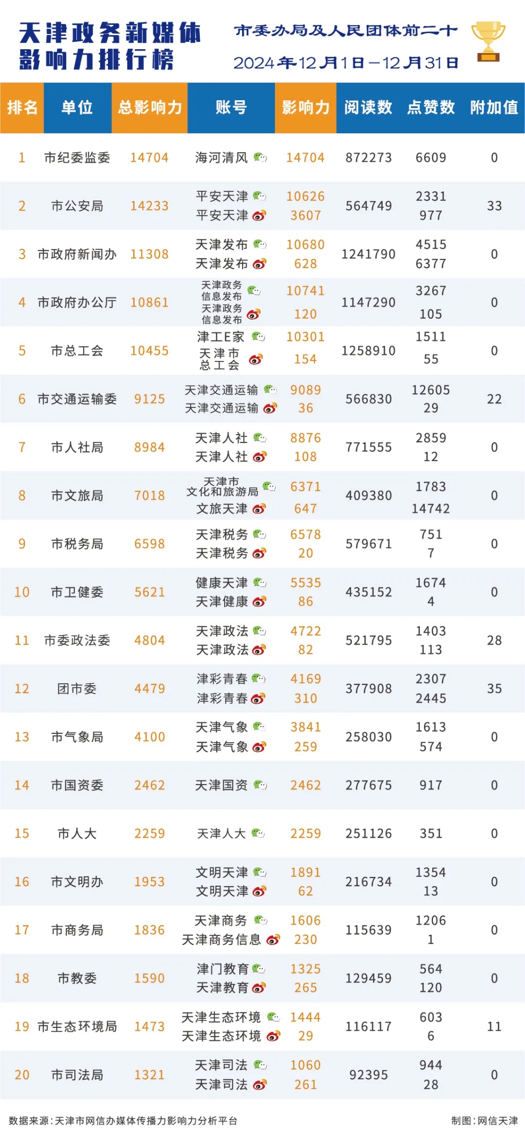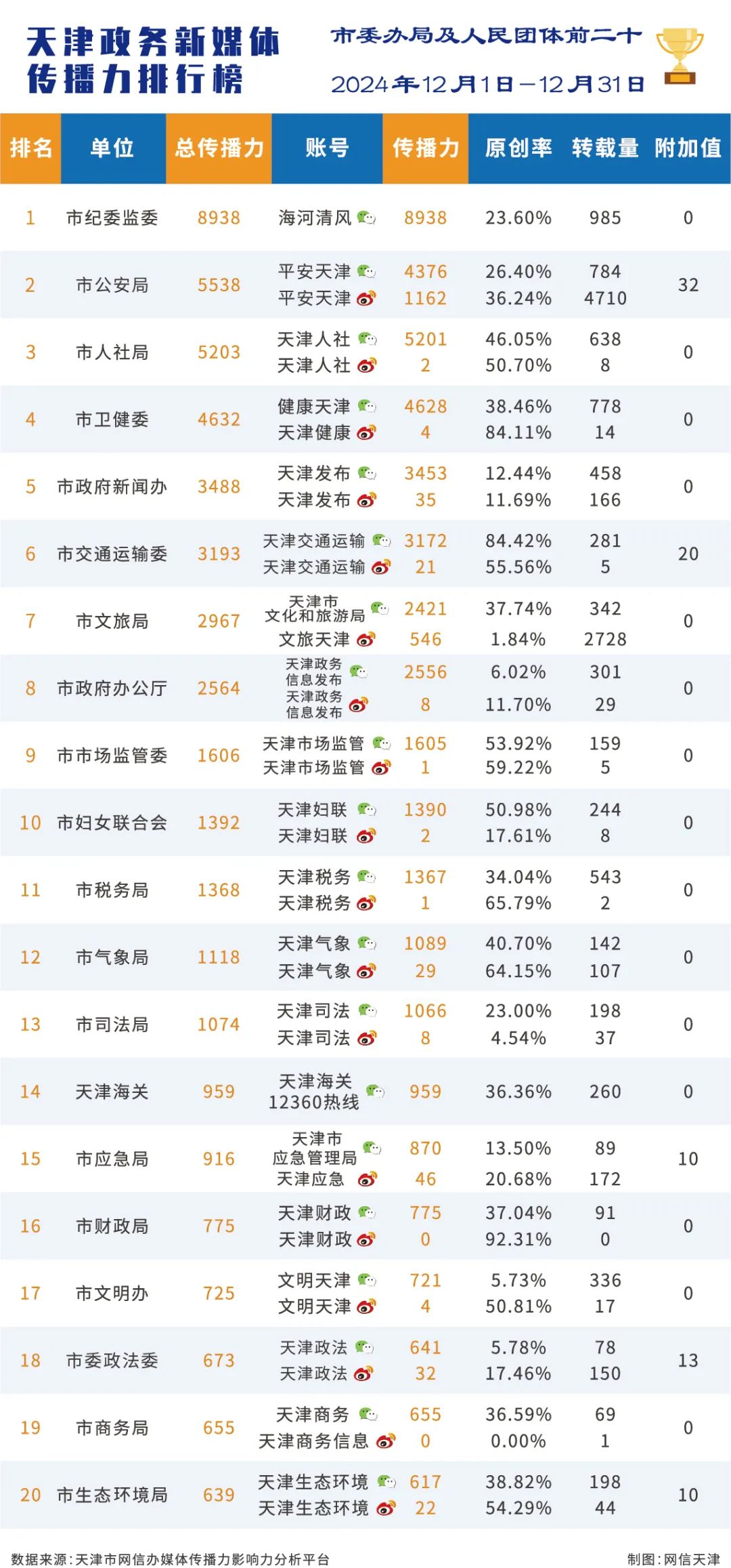 | 2024年12月份天津政务新媒体传播影响力排行榜 |