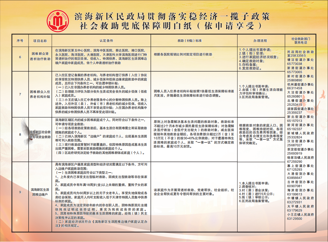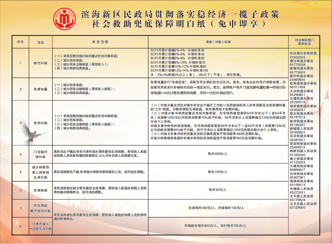 为全面落实党中央、国务院,市委、市政府和区委、区政府关于扎实稳住经济、完善社会民生兜底保障措施有关要求,日前滨海新区民政局梳理制定了《贯彻落实稳经济一揽子政策社会救助兜底保障政策明白纸》,并畅通社会救助“直通车”,落实急难救助24小时答复机制,及时回应群众诉求,切实保障好城乡困难群众基本生活。