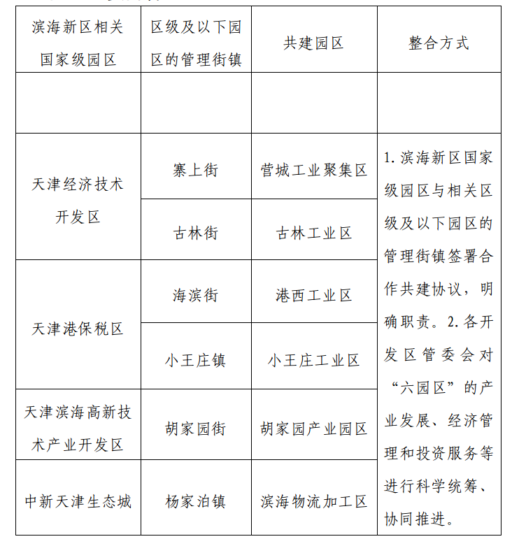 为使滨海新区工业园区规划布局更加合理,产业结构更加优化,管理水平更加提升,2020年由区工业和信息化局牵头制定《滨海新区工业园区深化整合实施意见》,意见中明确街镇六个工业园区分别与经开区、保税区、高新区和中新生态城采取合作共建方式深化整合。
