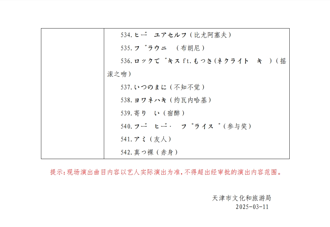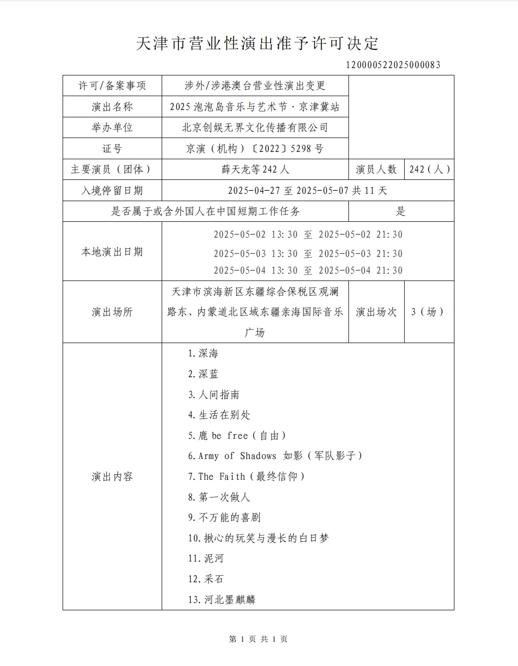 天津市营业性演出准予许可决定(120000522025000083)