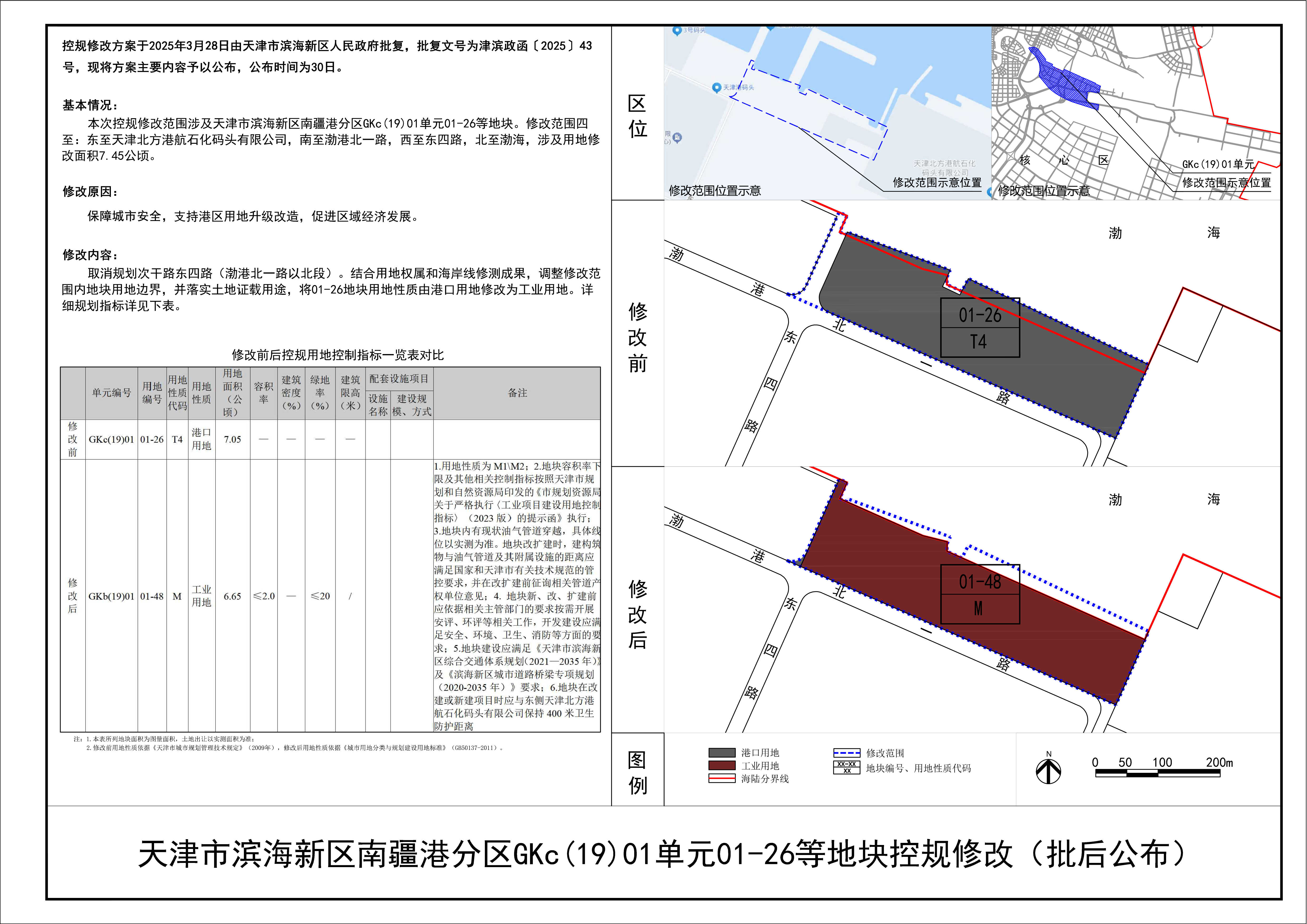 关于天津市滨海新区南疆港分区GKc(19)01单元01-26等地 块控规修改批后的公布