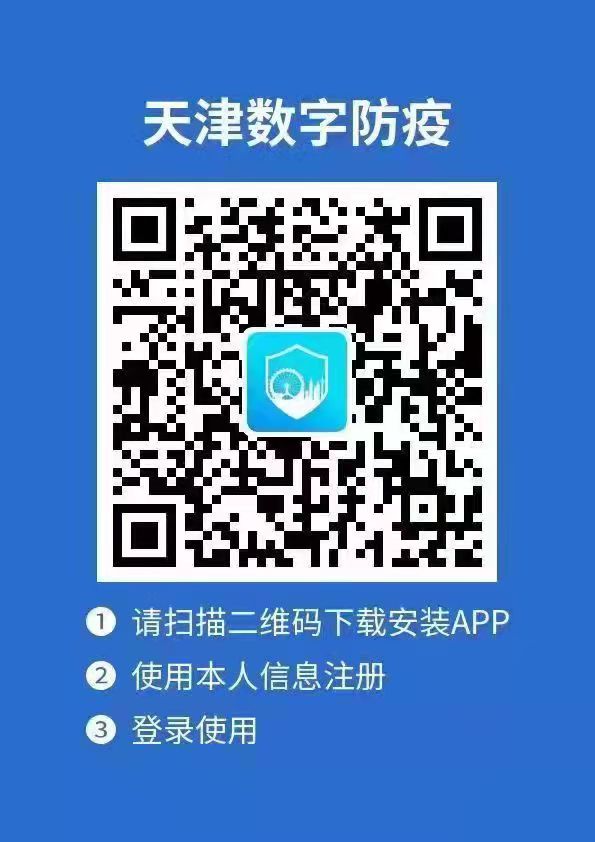 请您扫描以下二维码下载安装“天津数字防疫”APP,使用本人信息注册登录后可以编辑查询疫情防控相关信息,在以后开展的全员核酸筛查中,按照居住地筛查原则,若您在滨海新区居住,但因工作或其他特殊原因无法在滨海新区参加核酸检测,进行信息报备,或通过电话联系所在村居委会进行报备。