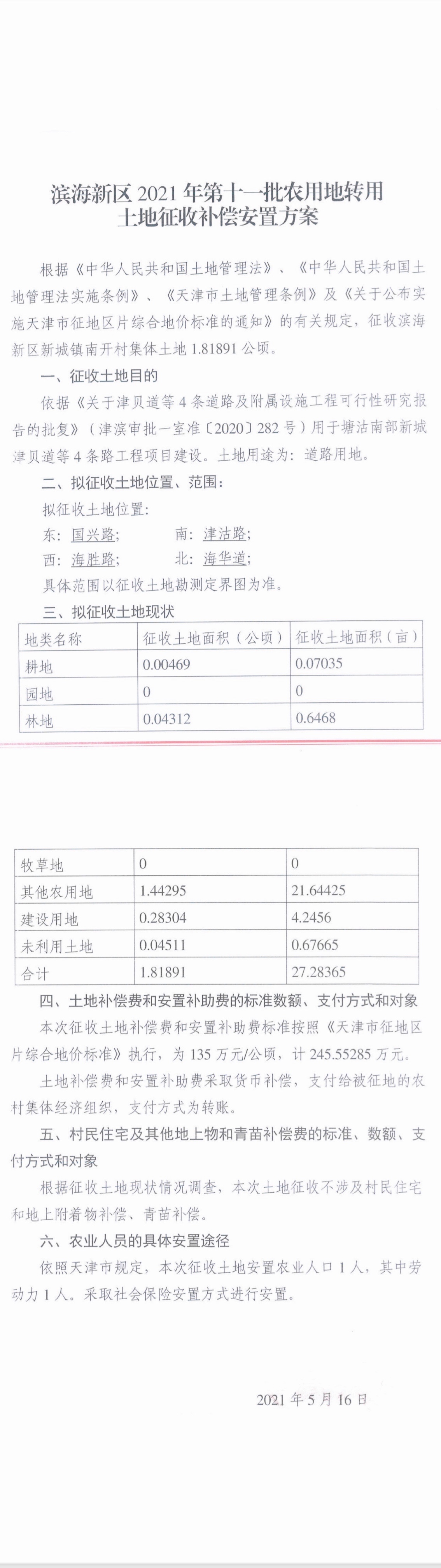 滨海新区2021年第十一批农用地转用土地征收补偿安置方案