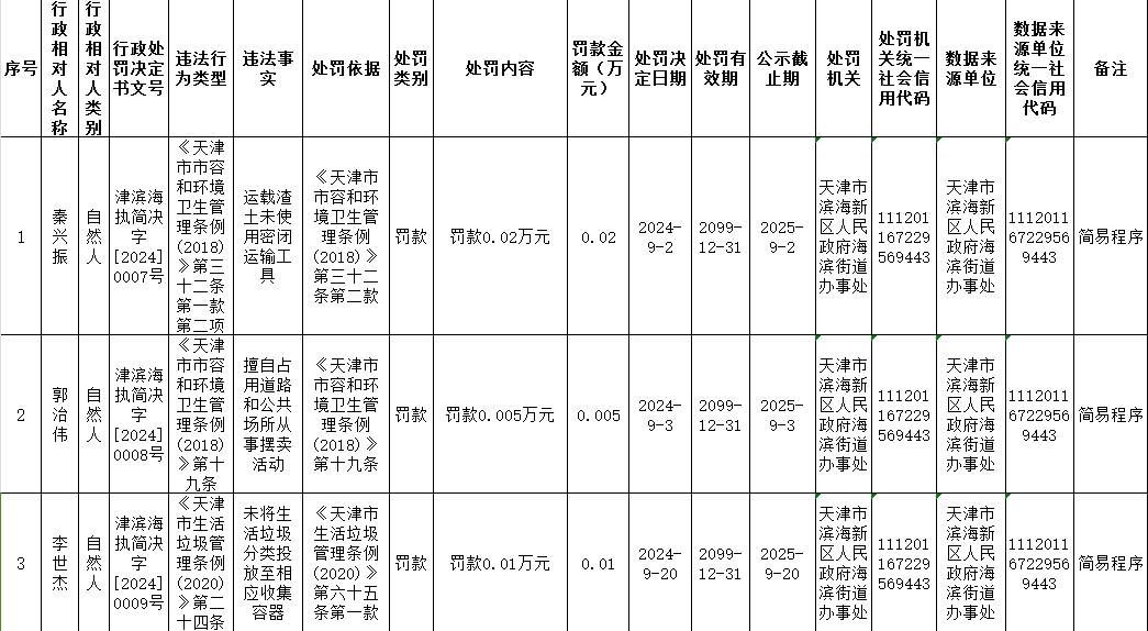 海滨街2024年9月行政处罚
