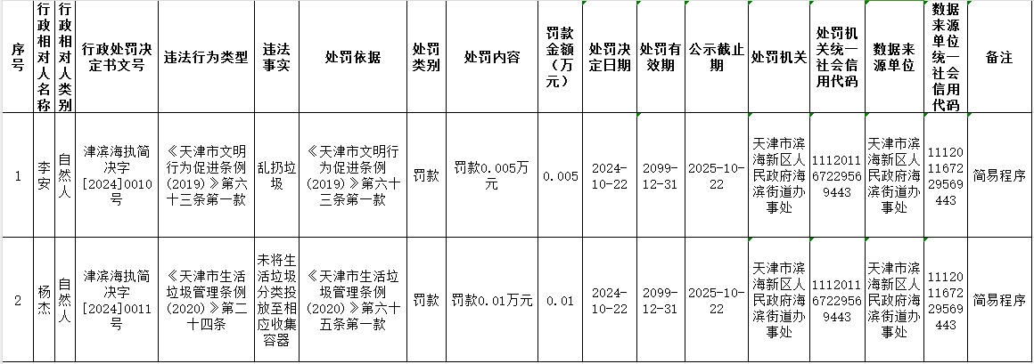 海滨街2024年10月行政处罚