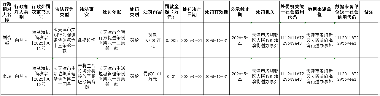 海滨街2025年5月行政处罚