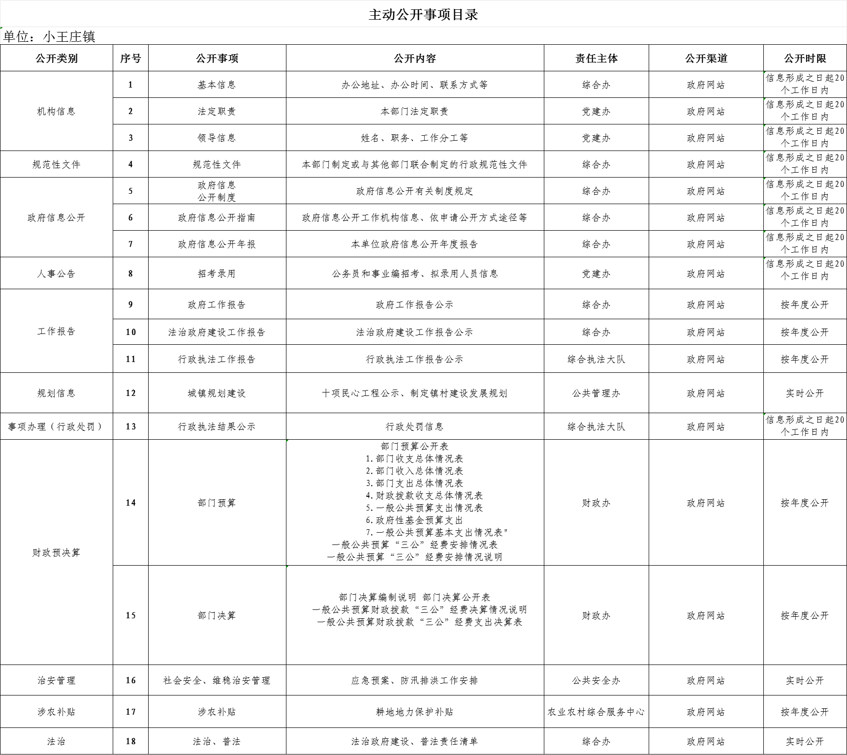 小王庄镇主动公开事项目录