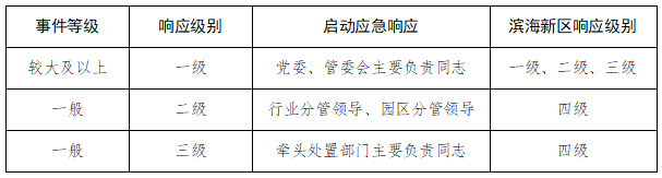 各类突发事件按照其性质、严重程度、可控性和影响范围,从高到低分为:特别重大、重大、较大、一般四个等级,具体分级标准根据国家有关规定执行。国家尚未制定等级标准的,依据天津市人民政府、滨海新区人民政府有关规定执行。