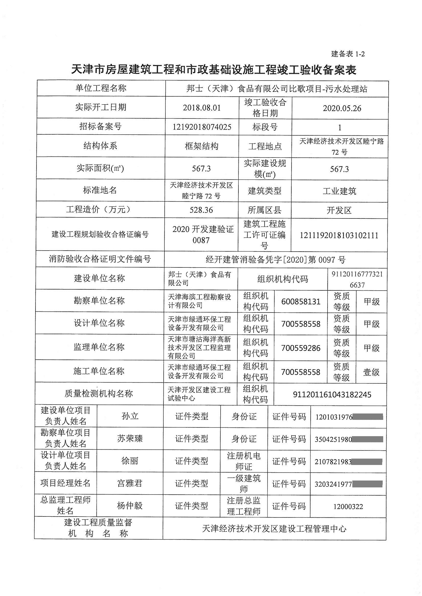 邦士(天津)食品有限公司比歌项目—污水处理站竣工验收备案