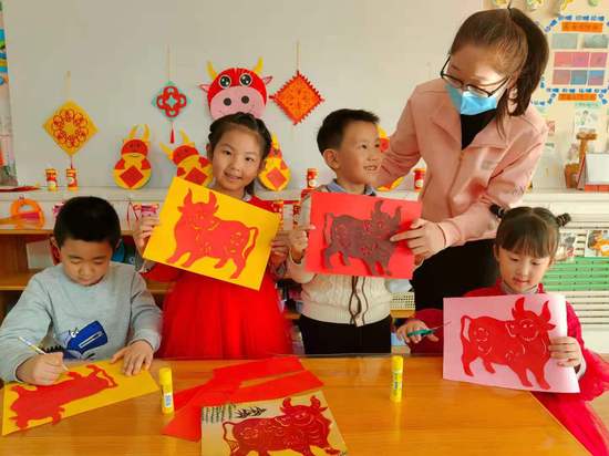 课堂上,孩子们在老师的帮助下尝试剪刻“春牛”图,一只只壮实的彩色吉祥牛在孩子们手中诞生。牛气冲天的“春牛”图,让年味更加浓厚。
