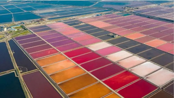 现场,很多游客都是第一次看到制盐的过程。游客们兴奋地爬上观景台远眺拍摄。高6米的观景台是利用日晒海盐堆成,专门为游客提供登盐山体验。盐在古代被称为“国之大宝”,也是古代重要财政收入, “登盐山、踩盐坨”象征着财富、祈福。观景台上可以看到结晶池、汉沽盐场古滩。其中最醒目的就是七彩盐田,这里是全国最大的海盐单池结晶区,占地3.2平方公里,有结晶池195个。从上世纪八十年代开始,汉沽盐场实施了大规模滩田改造,将分散的卤水集中到水池进行结晶。由于卤水中含有 “嗜盐菌”,它不仅能够促进产量,同时还能发挥净化卤水的作用,特别是每年夏秋季节的大量繁殖,使结晶池自然呈现红黄棕等不同颜色,五彩缤纷、自然天成,成为长芦盐田独具特色的景观。