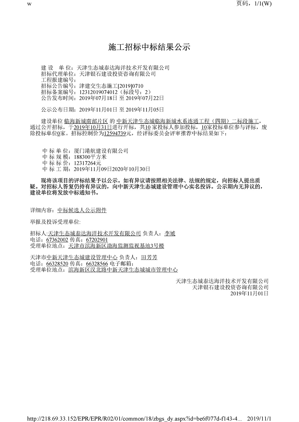 中新天津生态城临海新城水系连通工程(四期)二标段施工中标公示