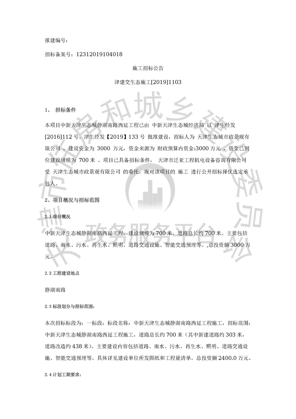 中新天津生态城静湖南路西延工程施工招标公告