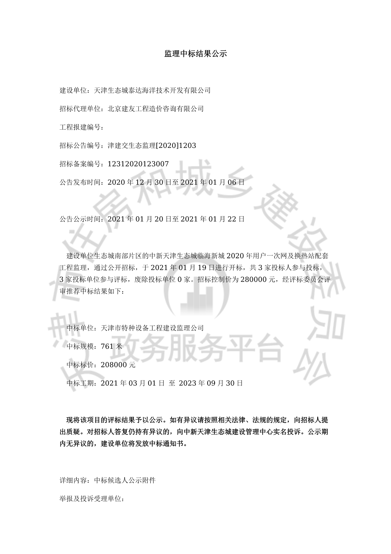中新天津生态城临海新城2020年用户一次网及换热站配套工程监理中标公示