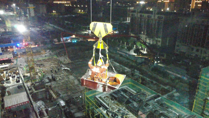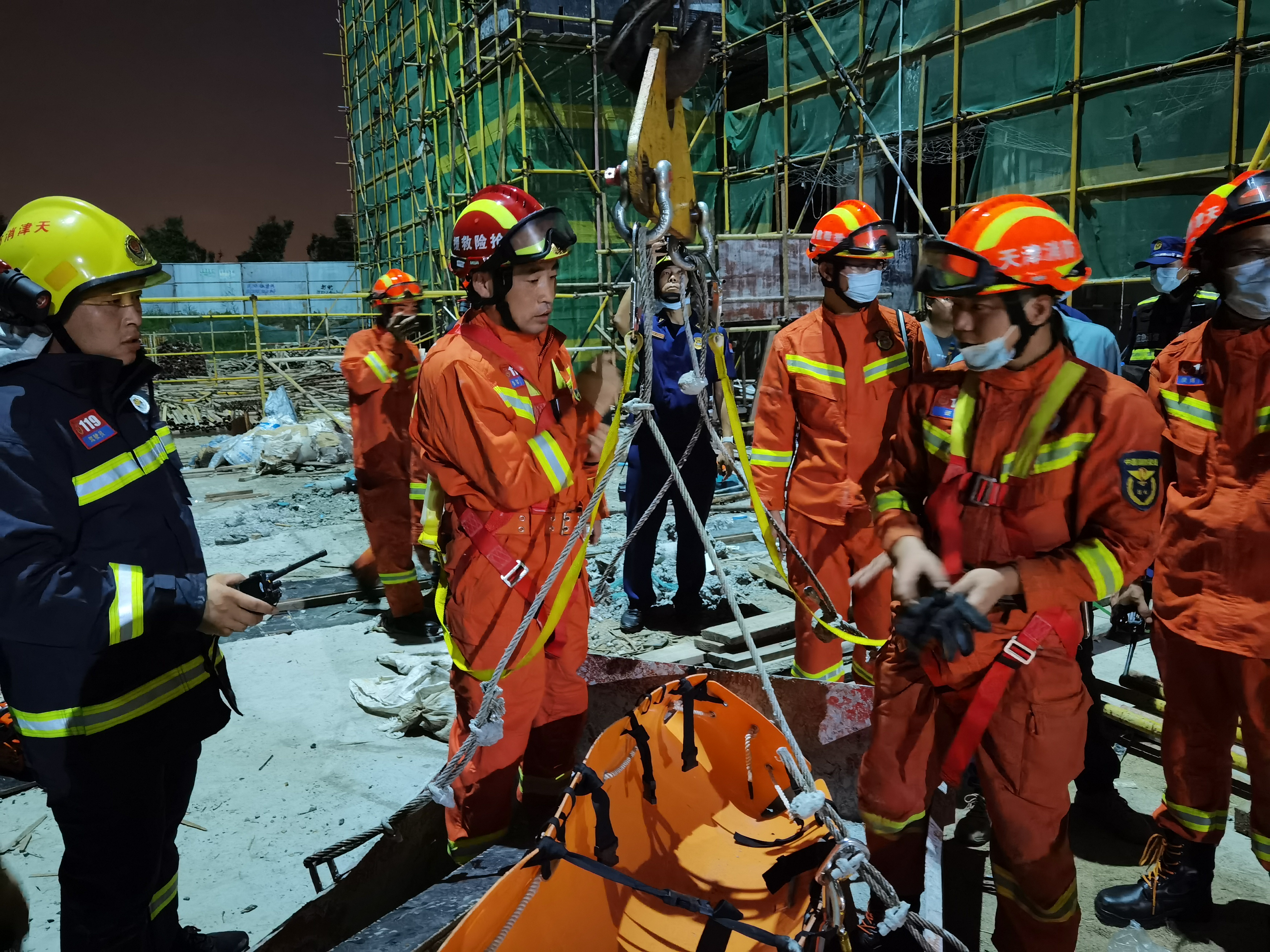 因事发地为建设工程施工现场,场地情况十分复杂,杂物纵横,大型举高车辆无法靠近,现场指挥部迅速决策,在制定好救援方案、设置好安全员的前提下,立即组织突击队,实施救援。