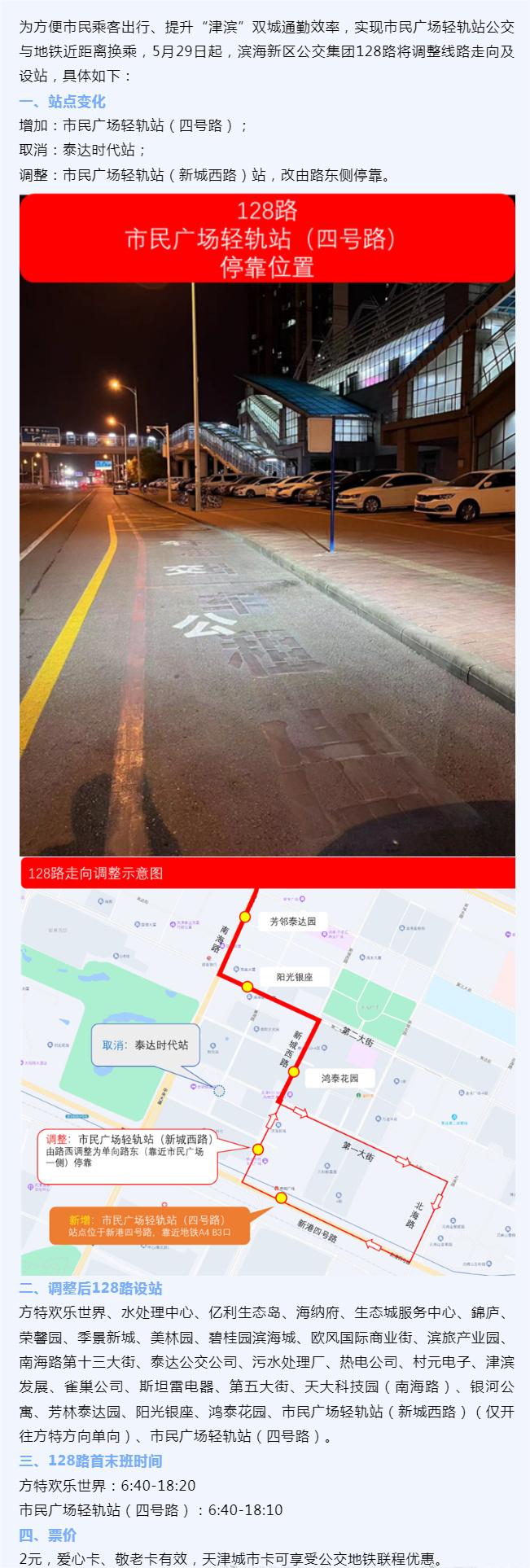 为方便市民乘客出行、提升“津滨”双城通勤效率,实现市民广场轻轨站公交与地铁近距离换乘,5月29日起,滨海新区公交集团128路将调整线路走向及设站,具体见下图。