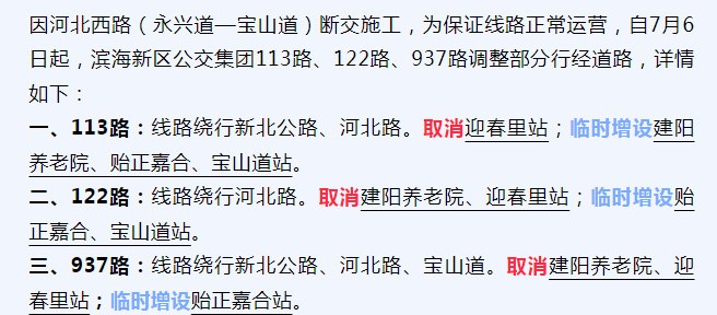 因河北西路(永兴道—宝山道)断交施工,为保证线路正常运营,自7月6日起,滨海新区公交集团113路、122路、937路调整部分行经道路。