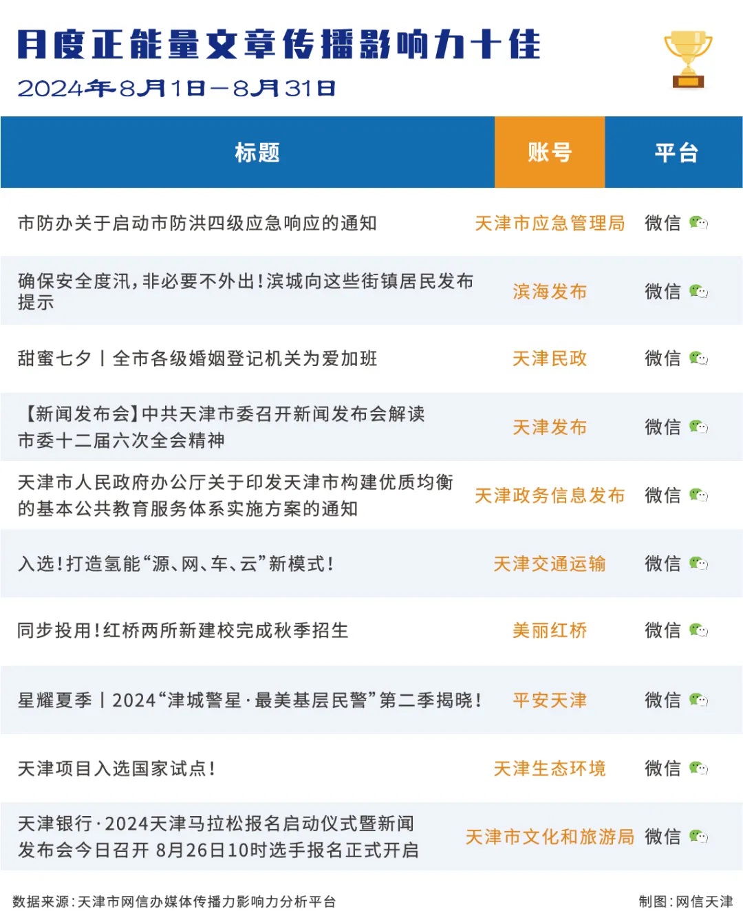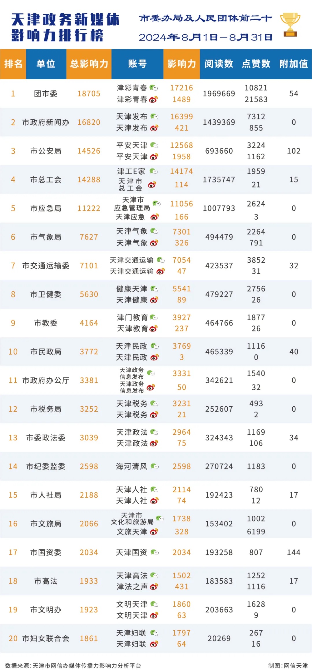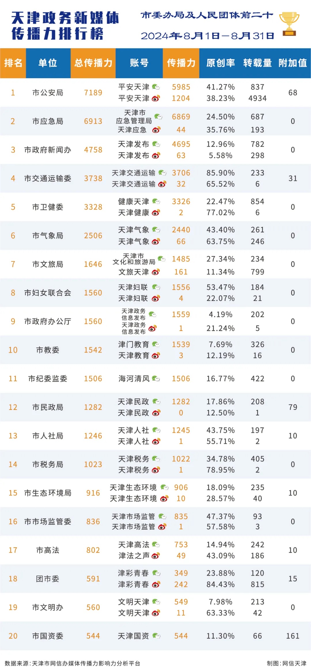 | 2024年8月份天津政务新媒体传播影响力排行榜 |