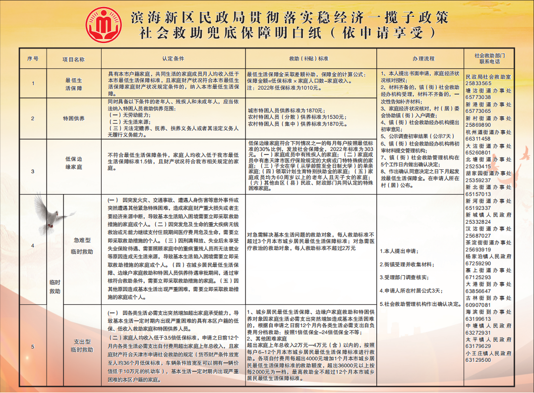 为全面落实党中央、国务院,市委、市政府和区委、区政府关于扎实稳住经济、完善社会民生兜底保障措施有关要求,日前滨海新区民政局梳理制定了《贯彻落实稳经济一揽子政策社会救助兜底保障政策明白纸》,并畅通社会救助“直通车”,落实急难救助24小时答复机制,及时回应群众诉求,切实保障好城乡困难群众基本生活。