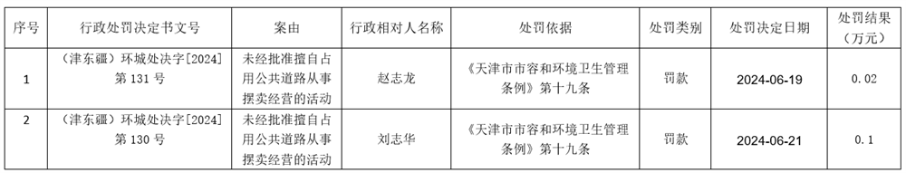 2024年6月19日至6月21日城市管理行政处罚信息