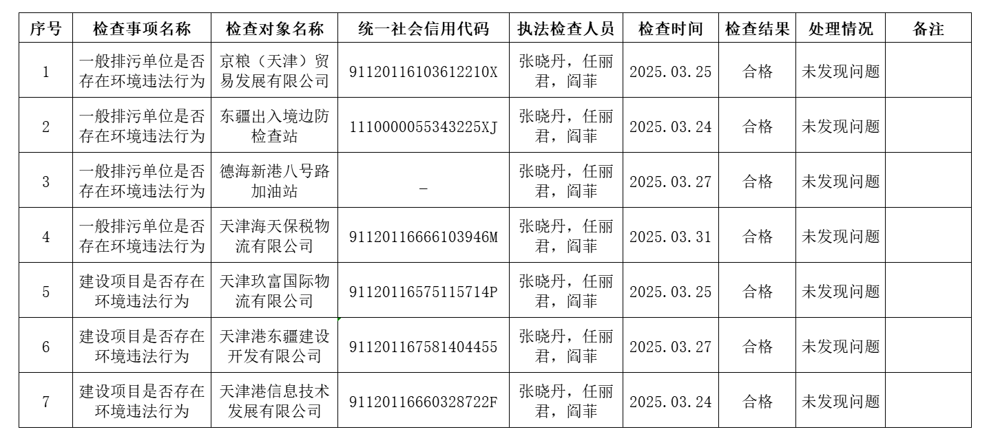 | 东疆综合保税区生态环境和城市管理局2025年第1季度双随机检查任务检查结果公示表 |