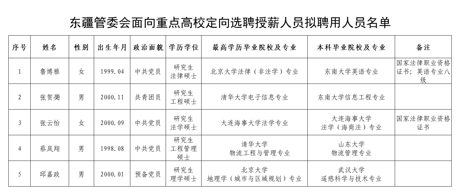 东疆管委会面向重点高校定向选聘授薪人员拟聘用人员名单