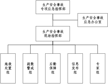 生产安全事故应急组织体系由街道生产安全事故专项应急指挥部及其下设的生产安全事故应急办公室、生产安全事故现场指挥部和五个工作小组,即施救处置组、疏散警戒组、后勤保障组、信息发布组、专家组(见图2-1)。