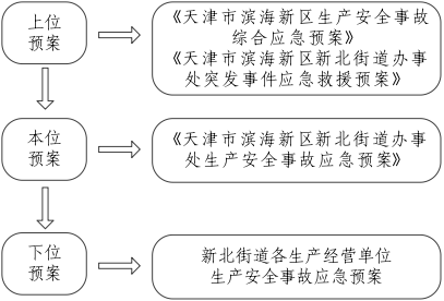 新北街道生产安全事故应急预案体系由天津市滨海新区新北街道办事处生产安全事故应急预案和生产经营单位生产安全事故应急预案构成。新北街道生产安全事故应急预案体系如下图。