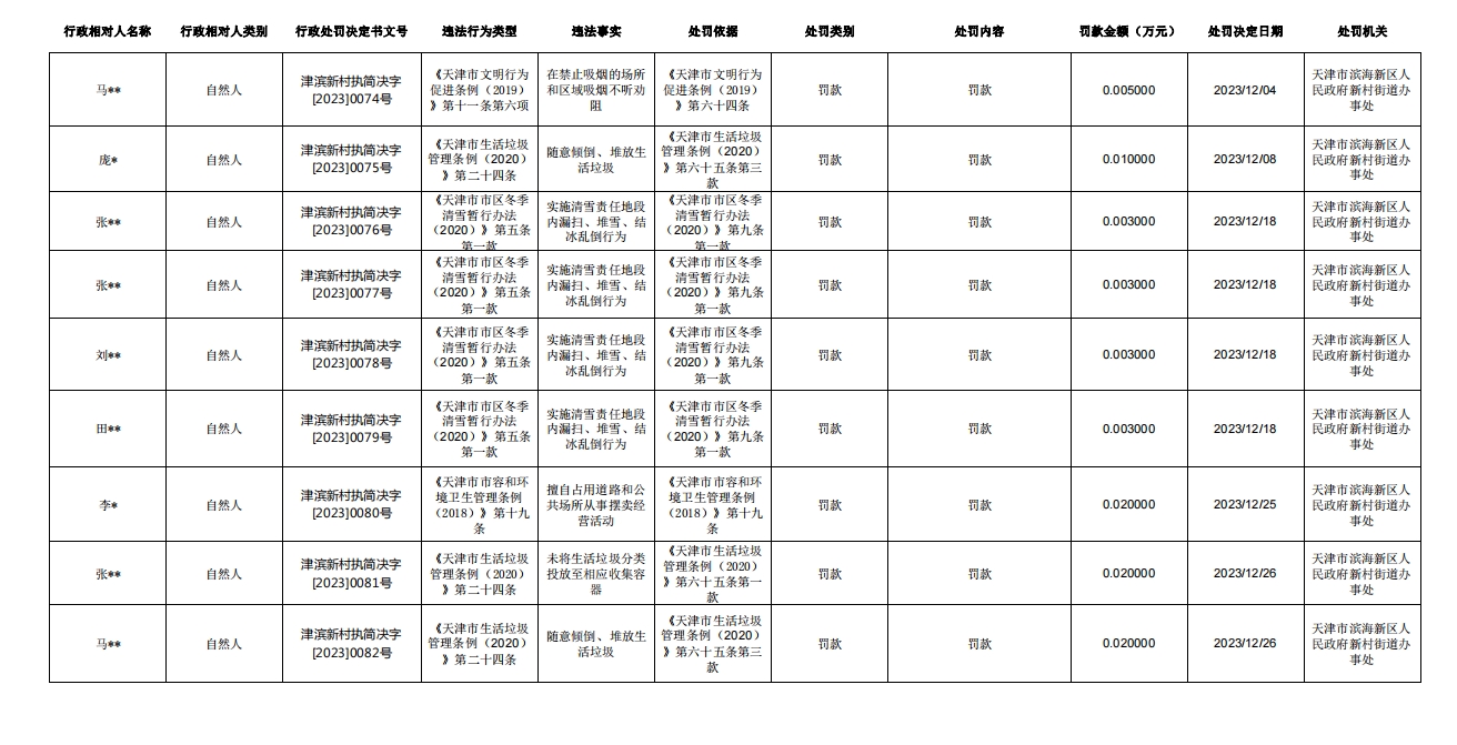 新村街道2023年12月行政处罚