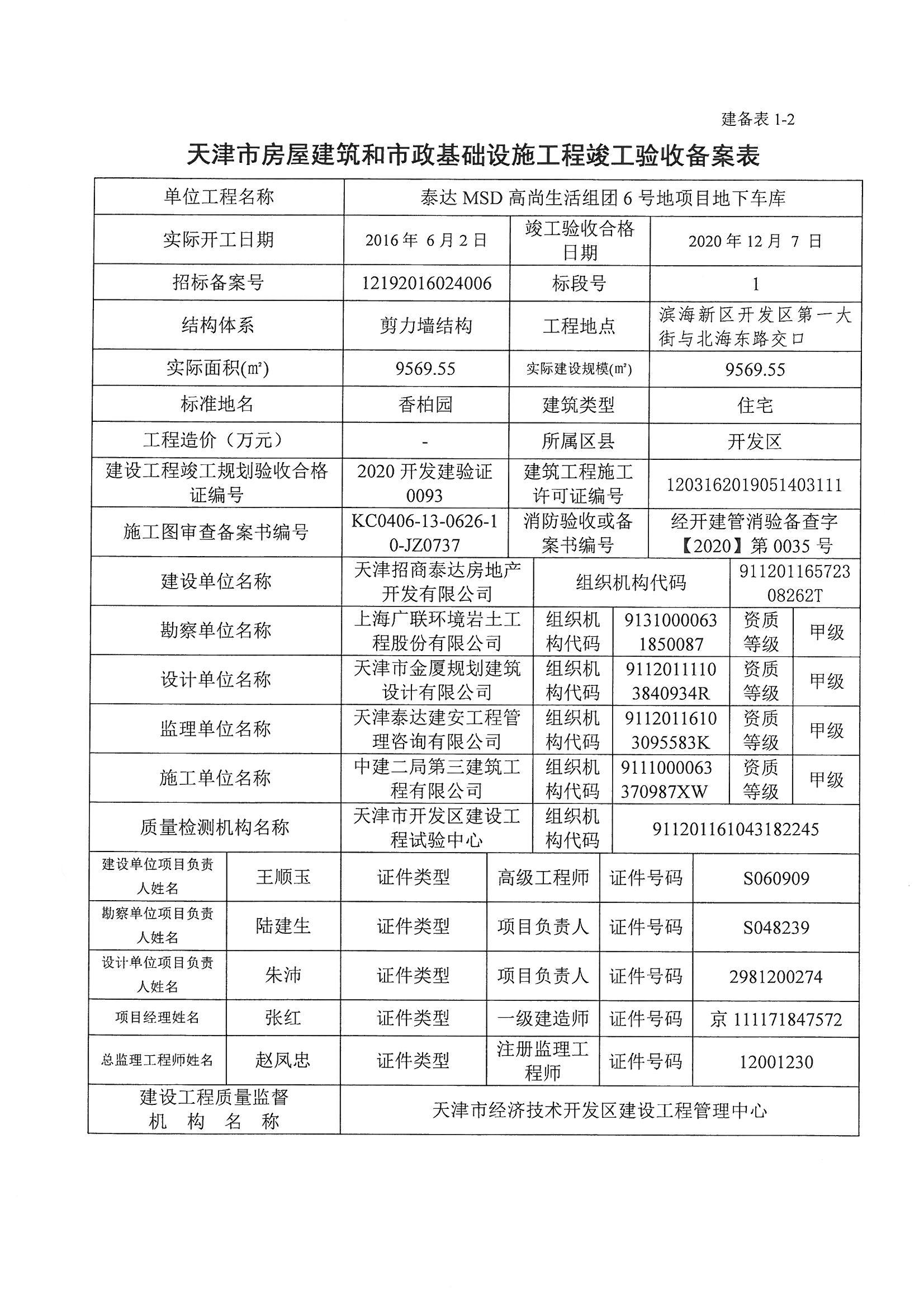 泰达MSD高尚生活组团6号地项目地下车库竣工验收备案