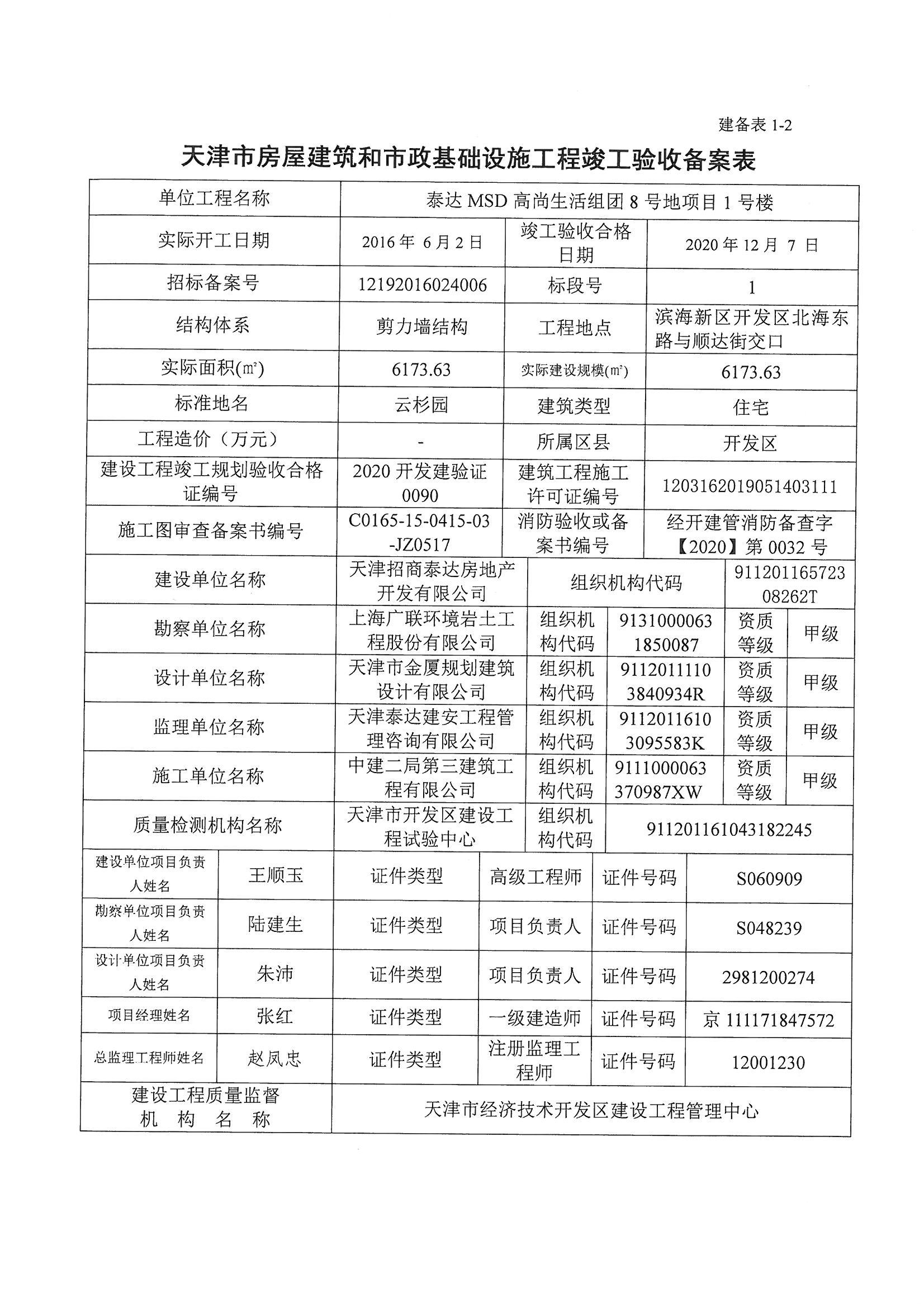 泰达MSD高尚生活组团8号地项目1号楼竣工验收备案