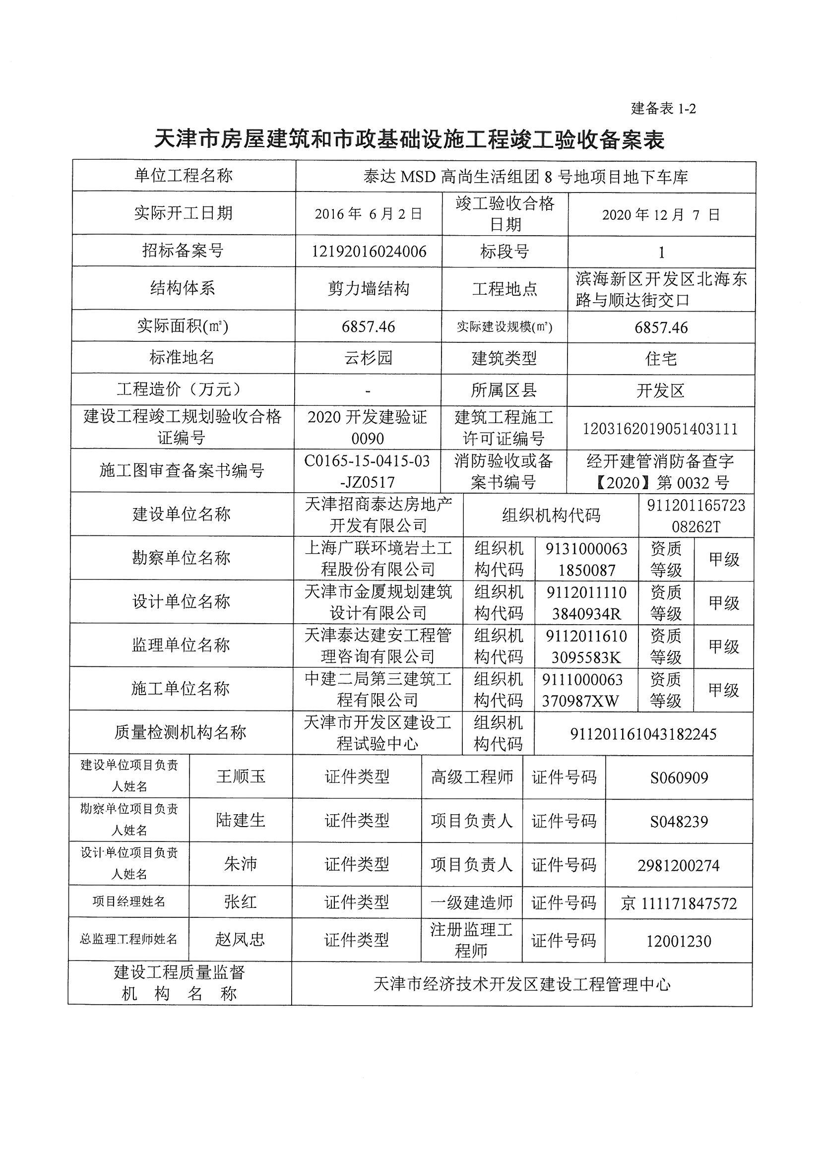 泰达MSD高尚生活组团8号地项目地下车库竣工验收备案