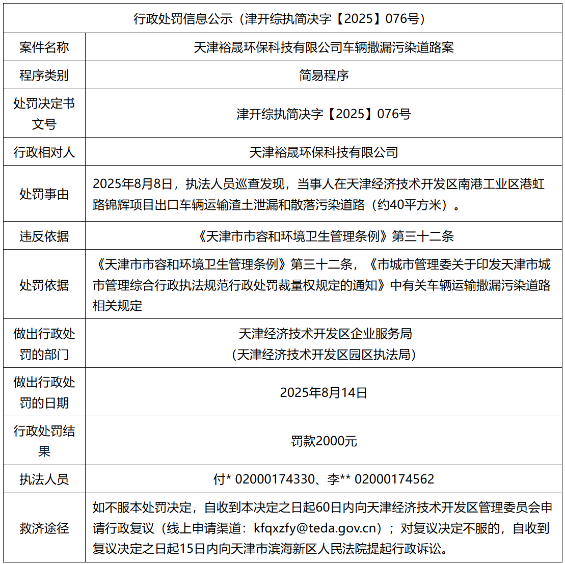 行政处罚信息公示(津开综执简决字【2025】076号)