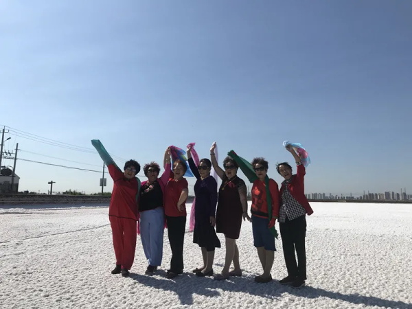游客崔淑兰说,自己从北京来,第一次来到天津。去过青海湖,如今来到这里,觉得这里盐海比青海湖还要壮观。日晒海盐均使用盐池板自然结盐,阳光照耀下煜煜生辉,犹如“玉板”。很多游客走进盐池,翩翩起舞。随着汉沽盐场机械化生产水平的不断提高,目前,海盐产量超过80万吨,是北方唯一的海盐原生态产地。每年采收季节,数十万吨海盐堆满坨地,蔚为壮观,远远望去犹如皑皑的雪山。