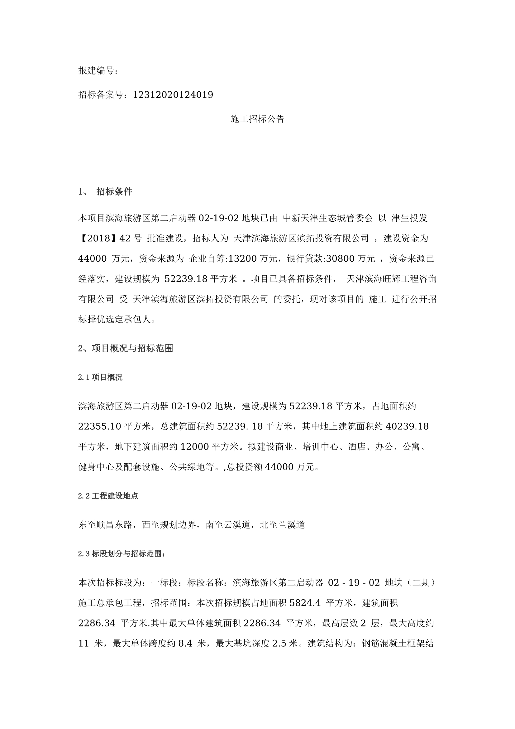 滨海旅游区第二启动器02-19-02地块(二期)施工总承包工程招标公告