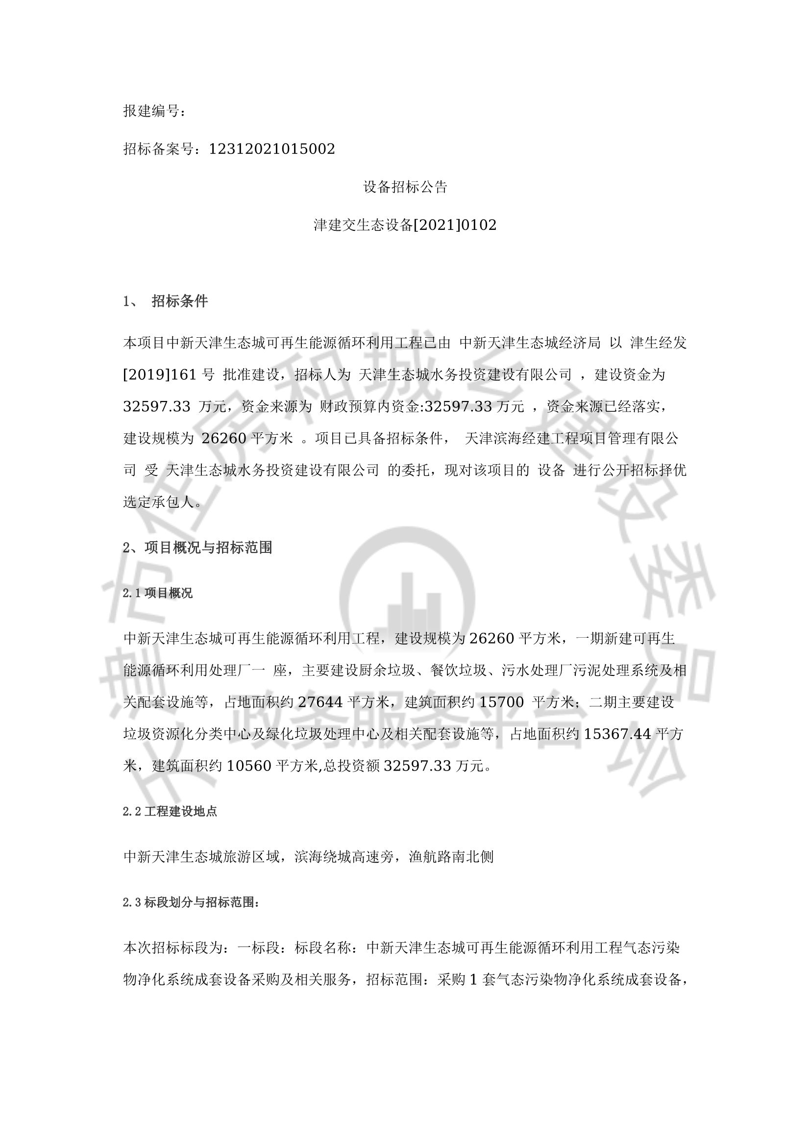 中新天津生态城可再生能源循环利用工程气态污染物净化系统成套设备采购及相关服务招标公告