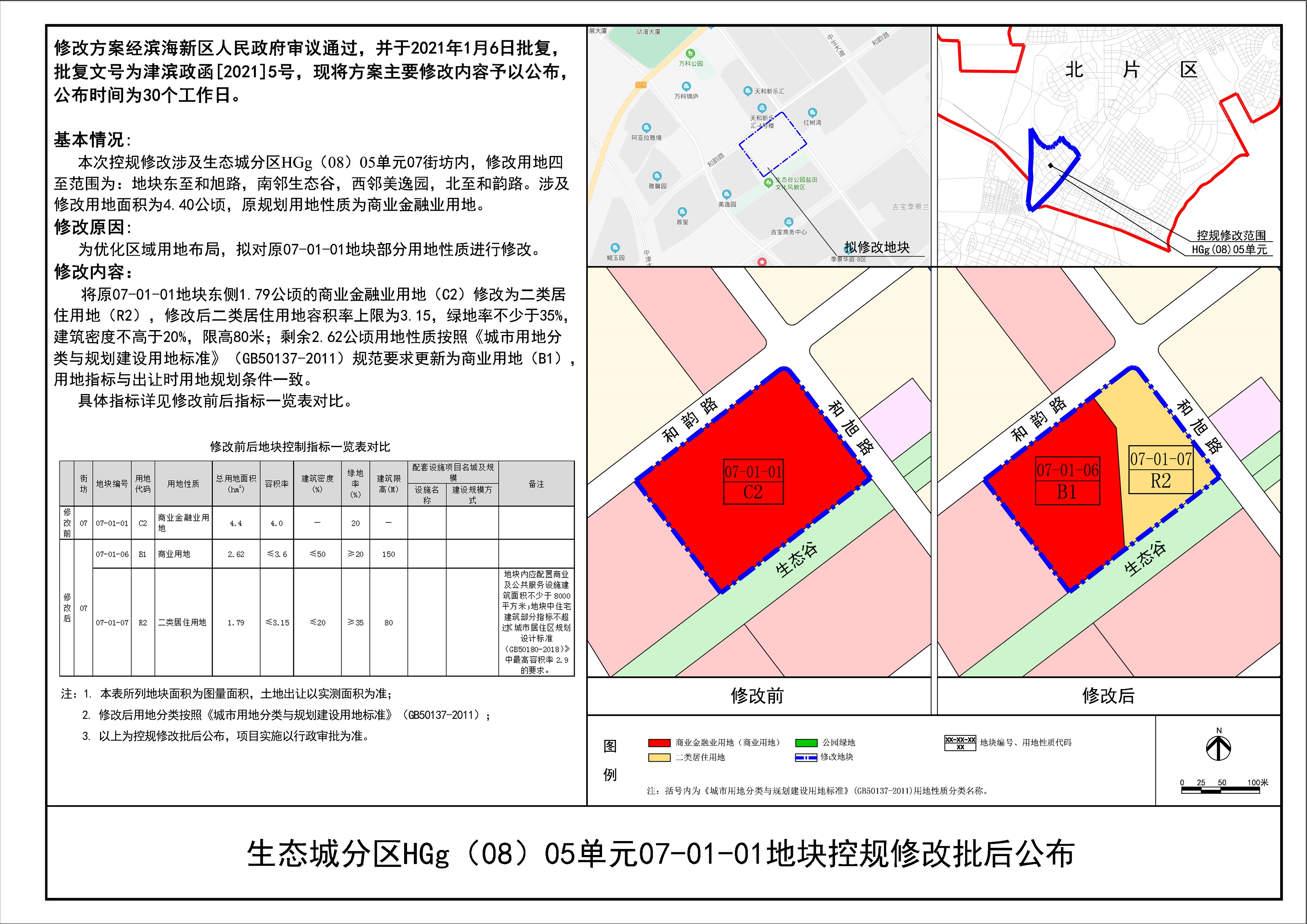 该地块控规修改方案经滨海新区人民政府审议通过,并于2021年1月6日批复,批复文号为津滨政函[2021]5号,现将方案主要修改内容予以公布,公布时间为30个工作日。