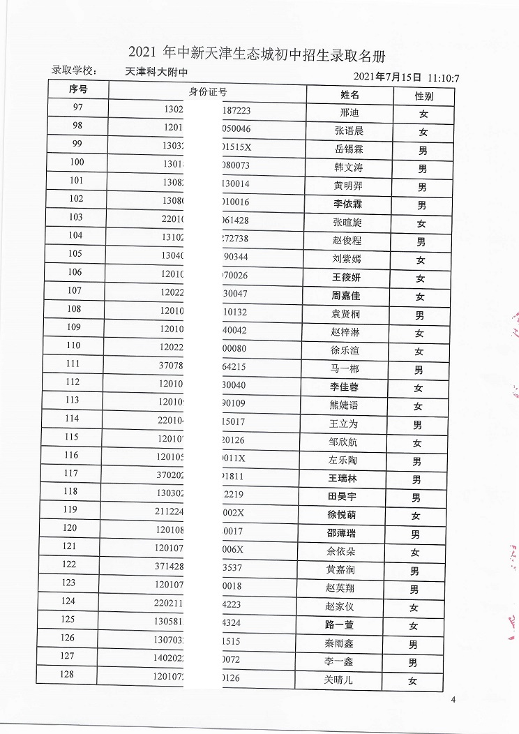 天津科技大学附属中学7年级录取名单