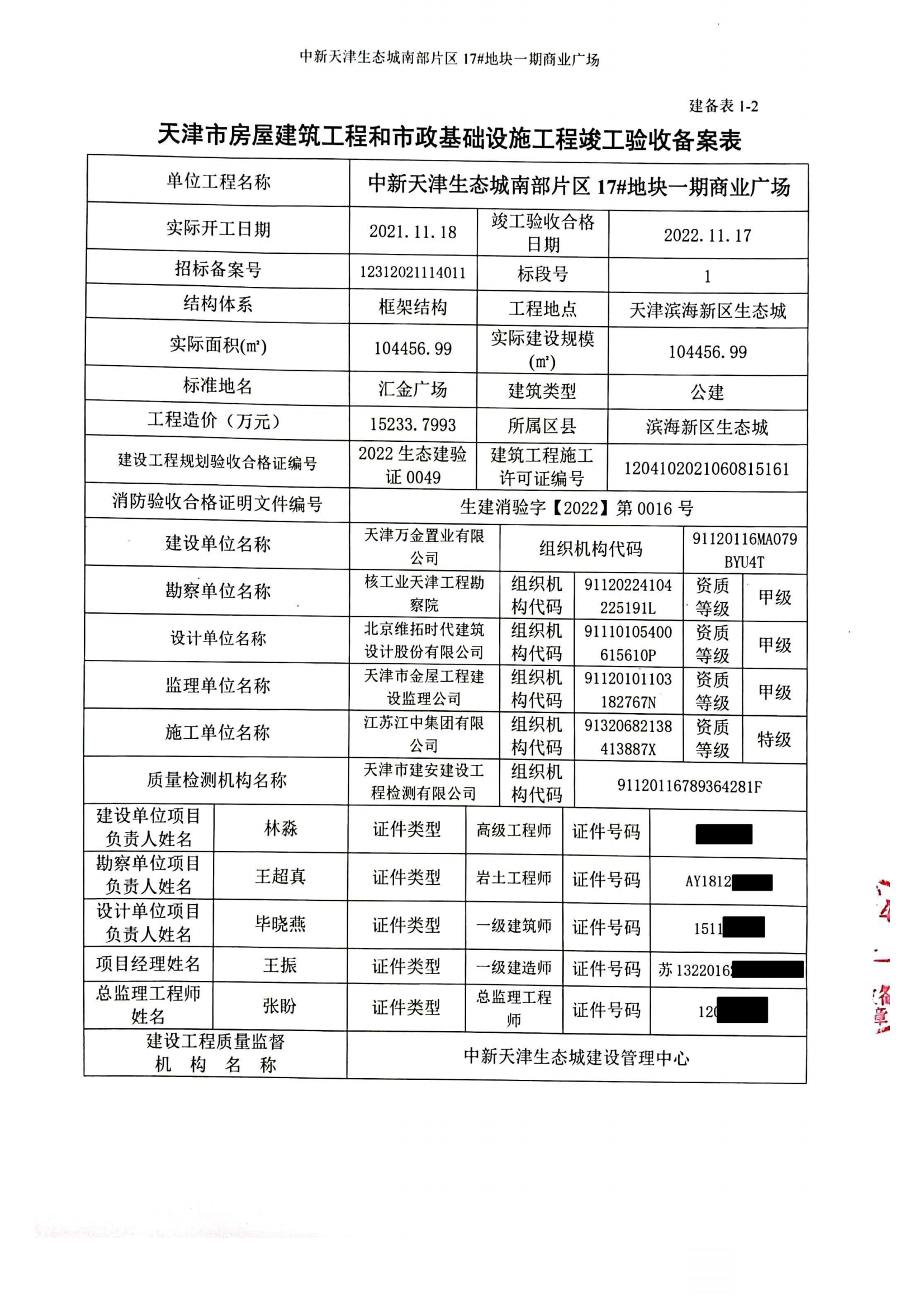 中新天津生态城南部片区17#地块一期商业广场竣工备案公布